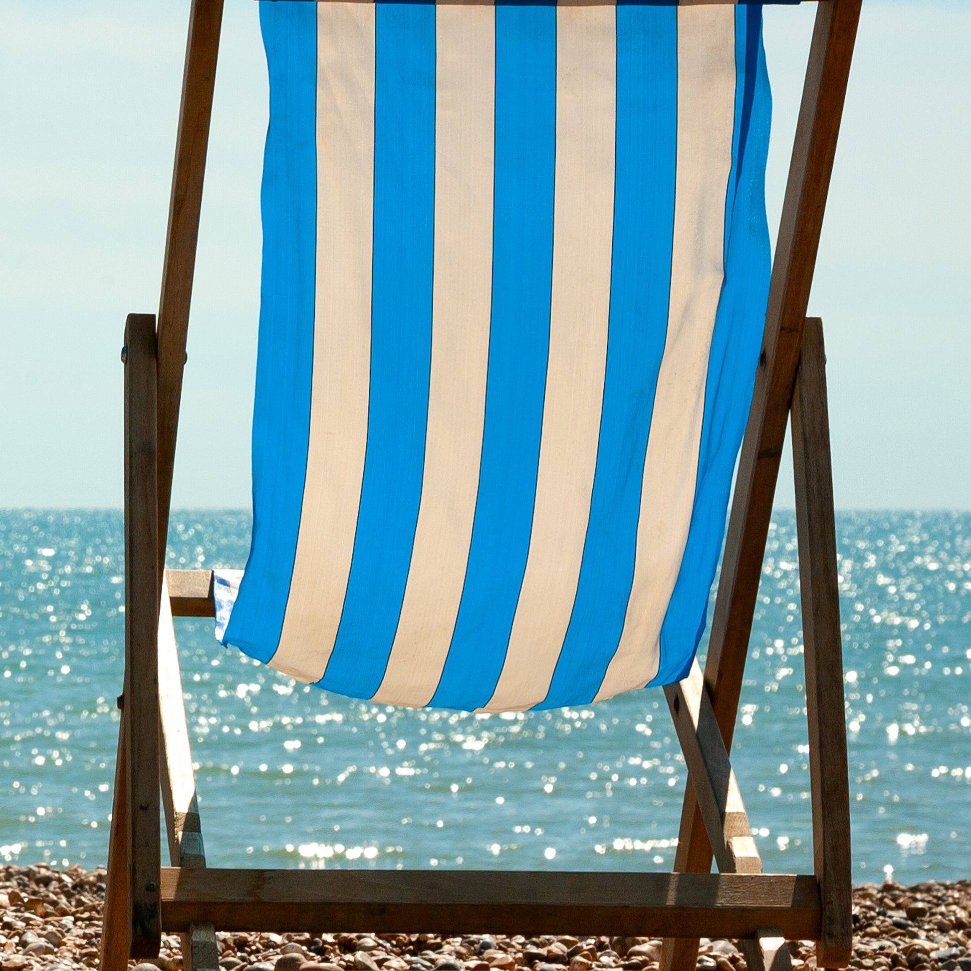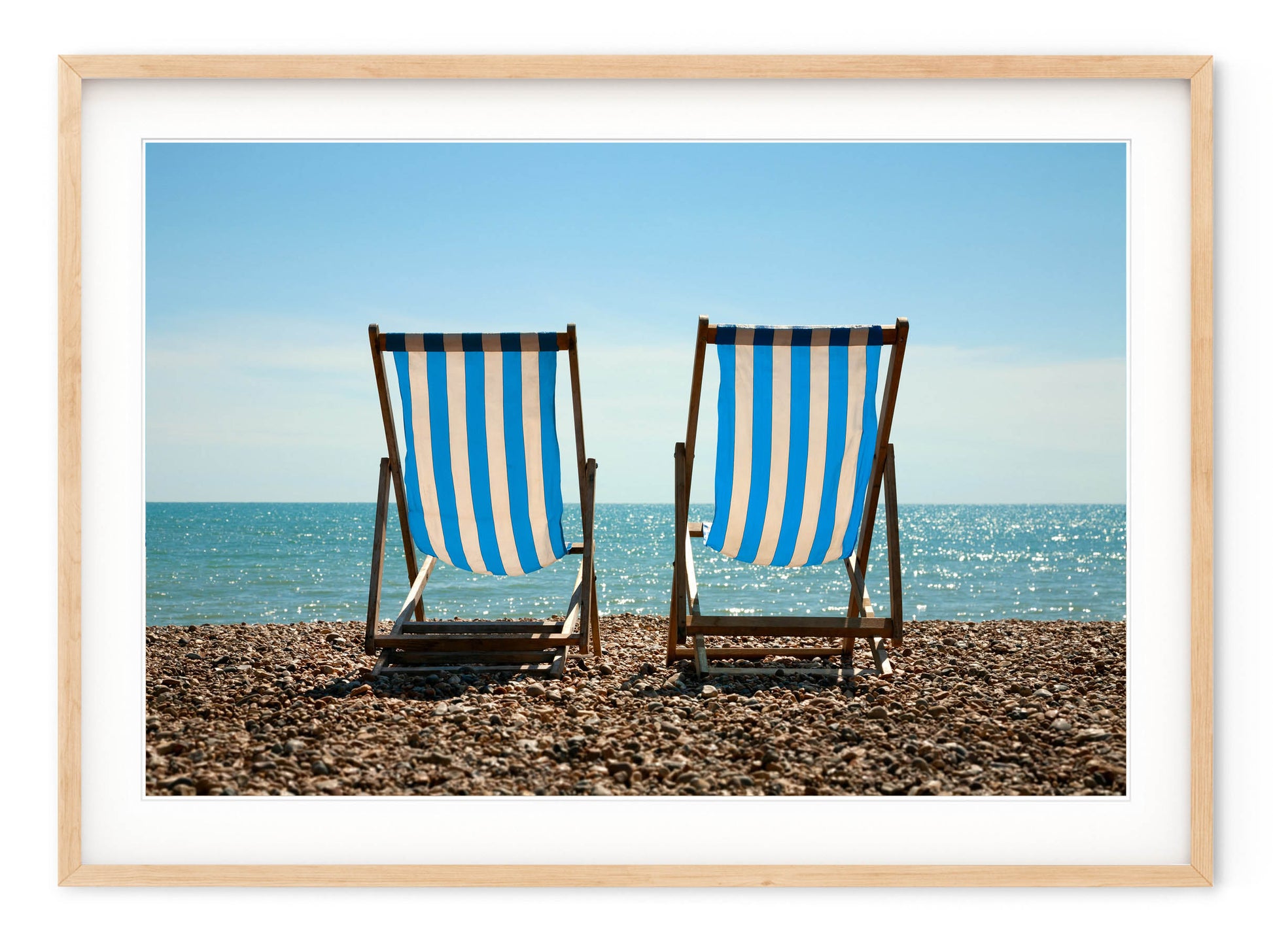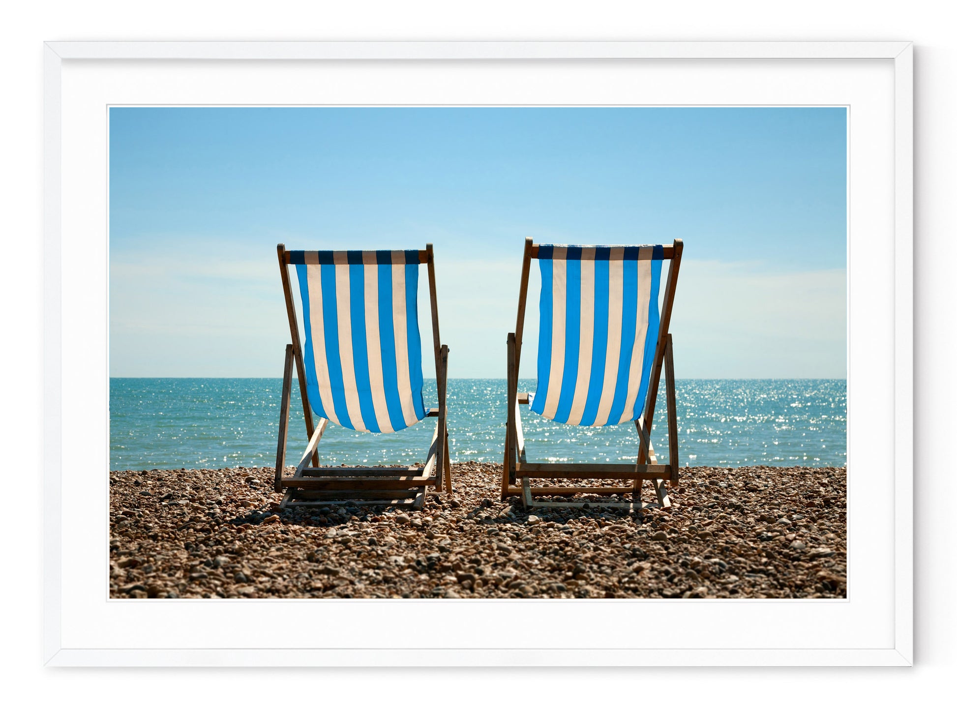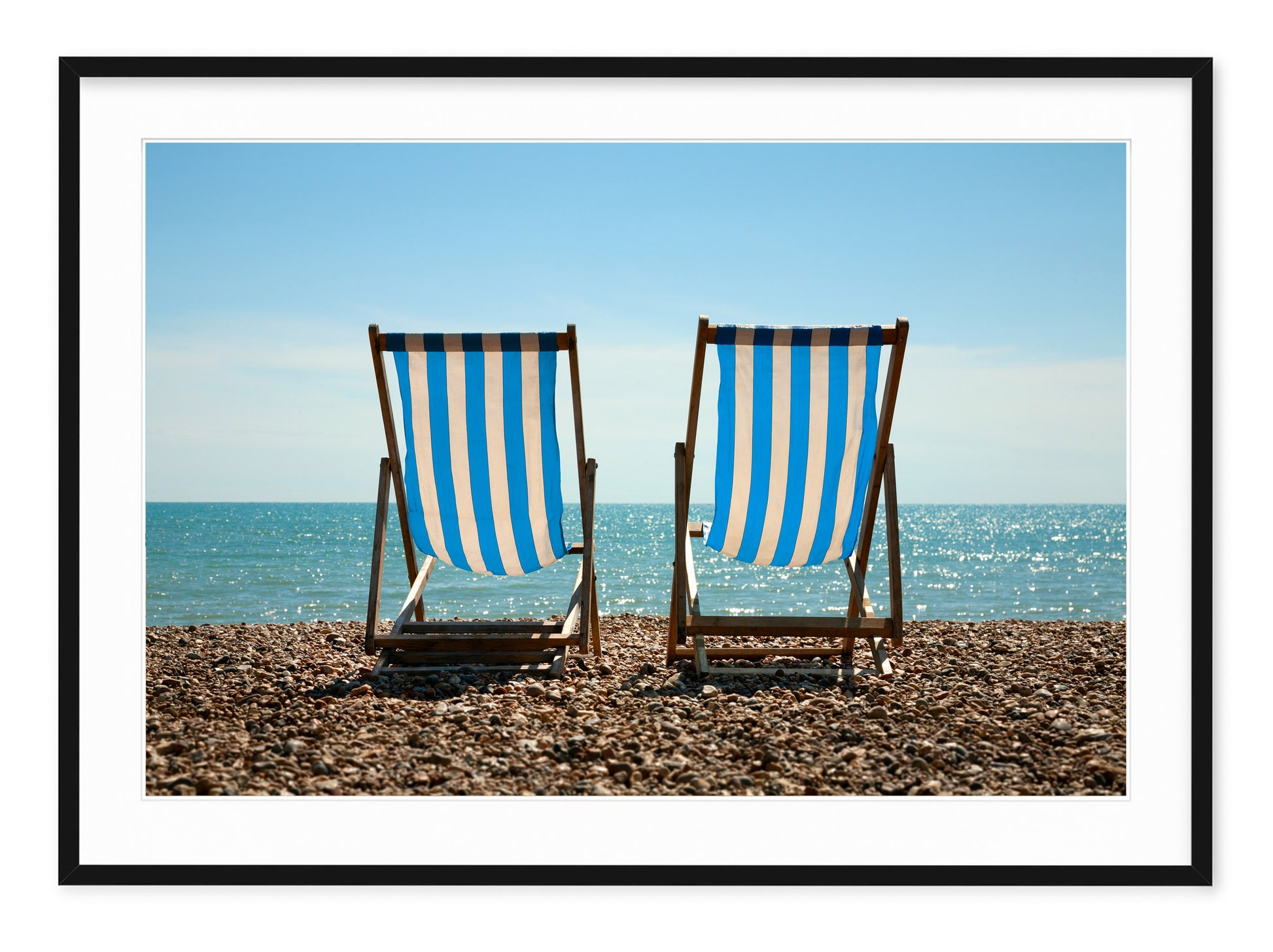 Description: Striped beach chairs on the stone beach in Brighton, England.