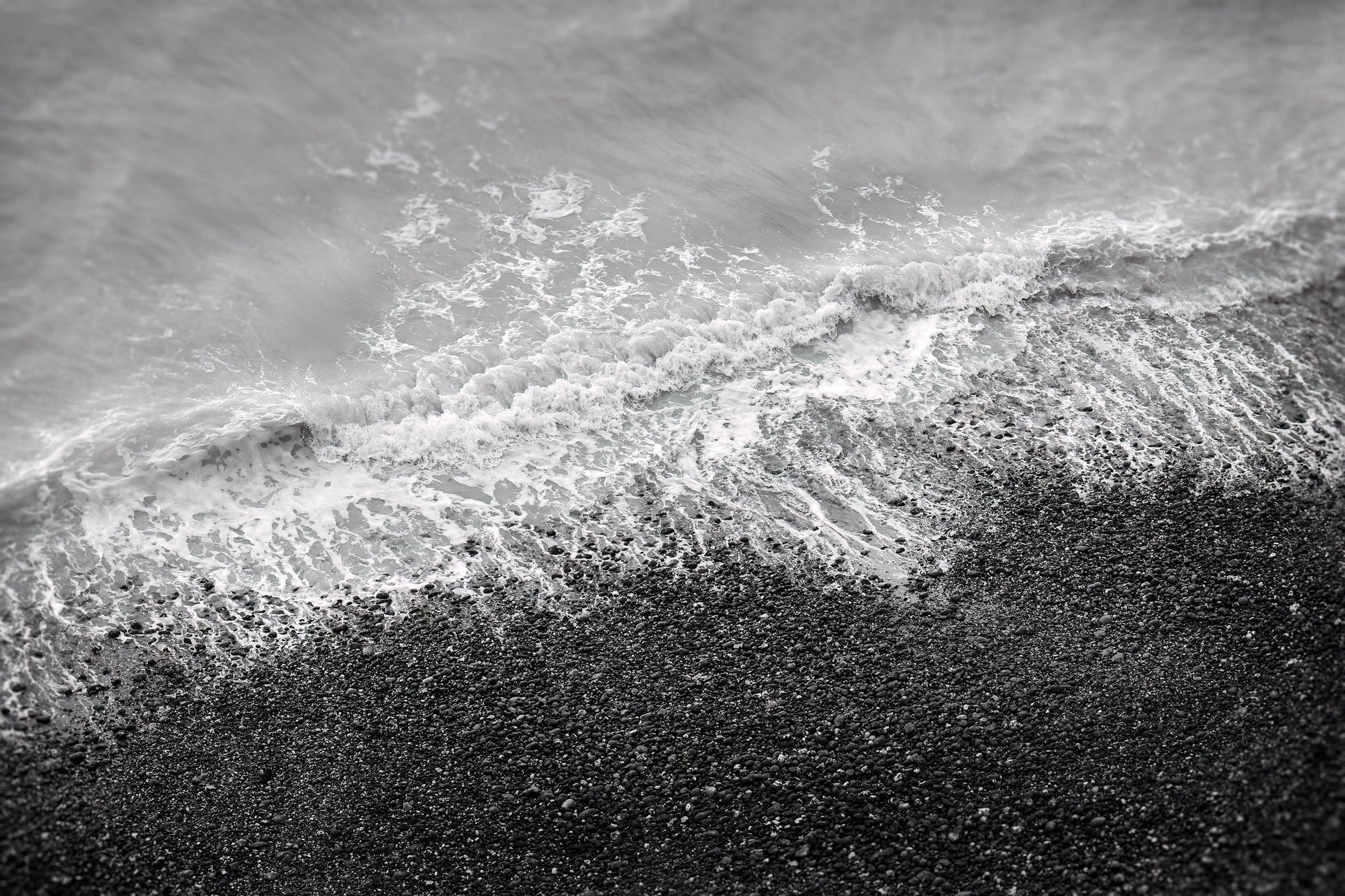 Description: Graphic landscape of waves on a black pebble beach on the south coast of England.