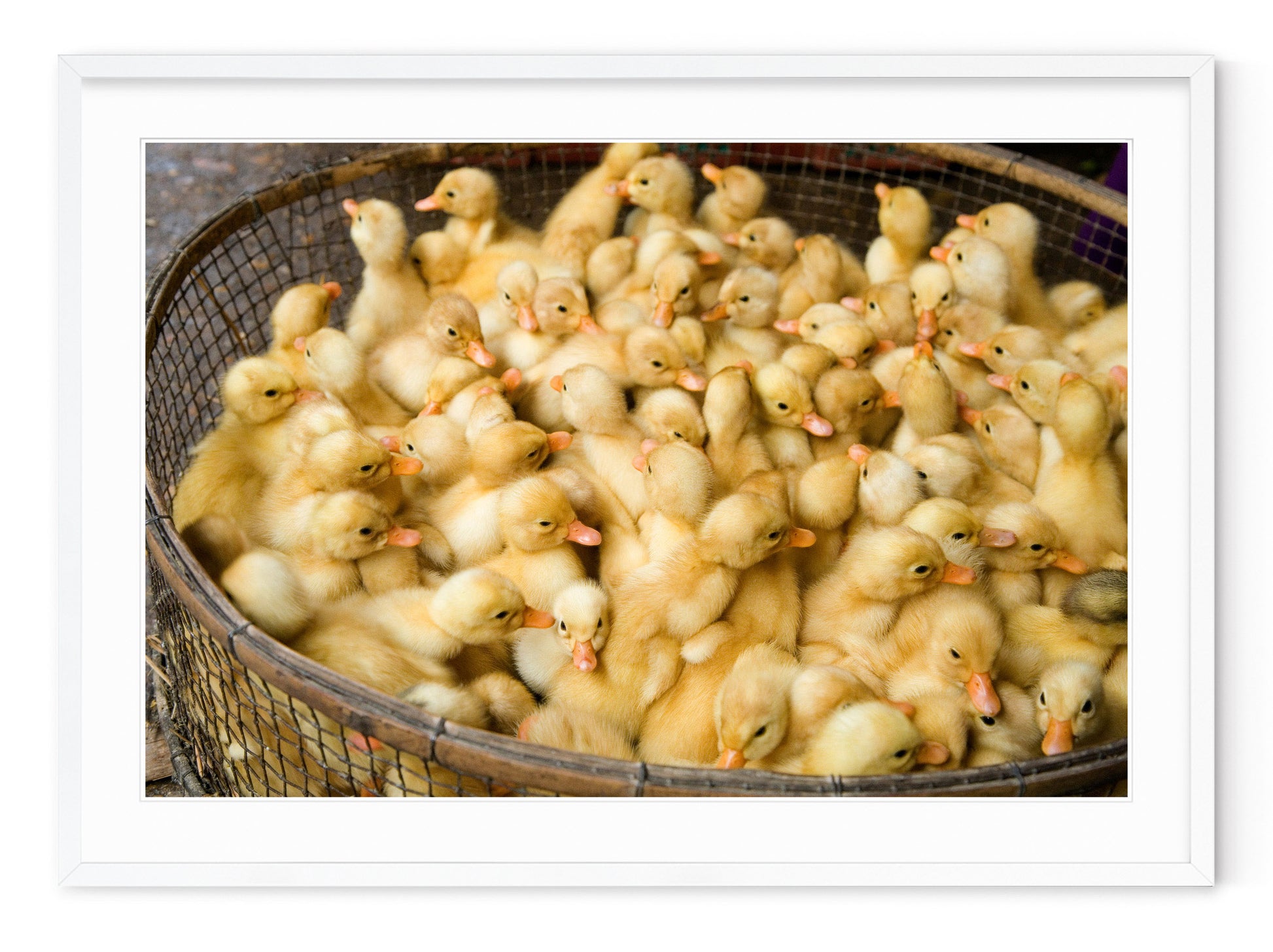 Description: Basket of ducklings for sale in market in Hoi An, Vietnam.
