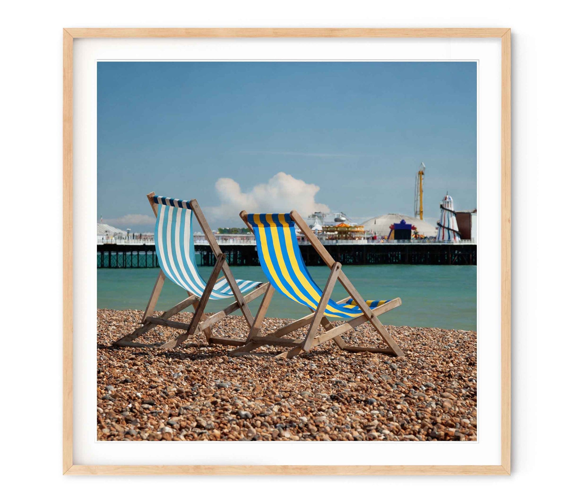 Description: Striped chairs on the beach of stones in Brighton, England.