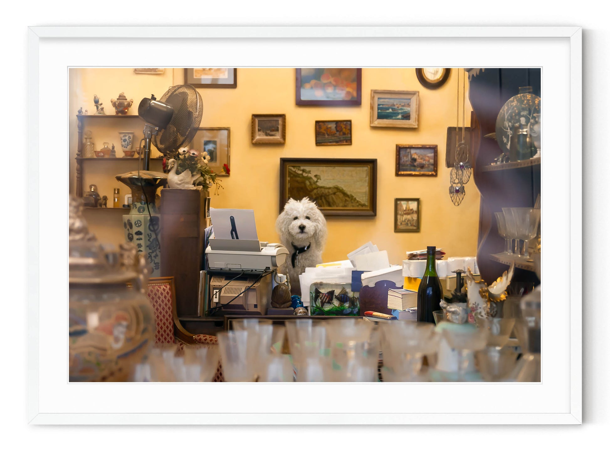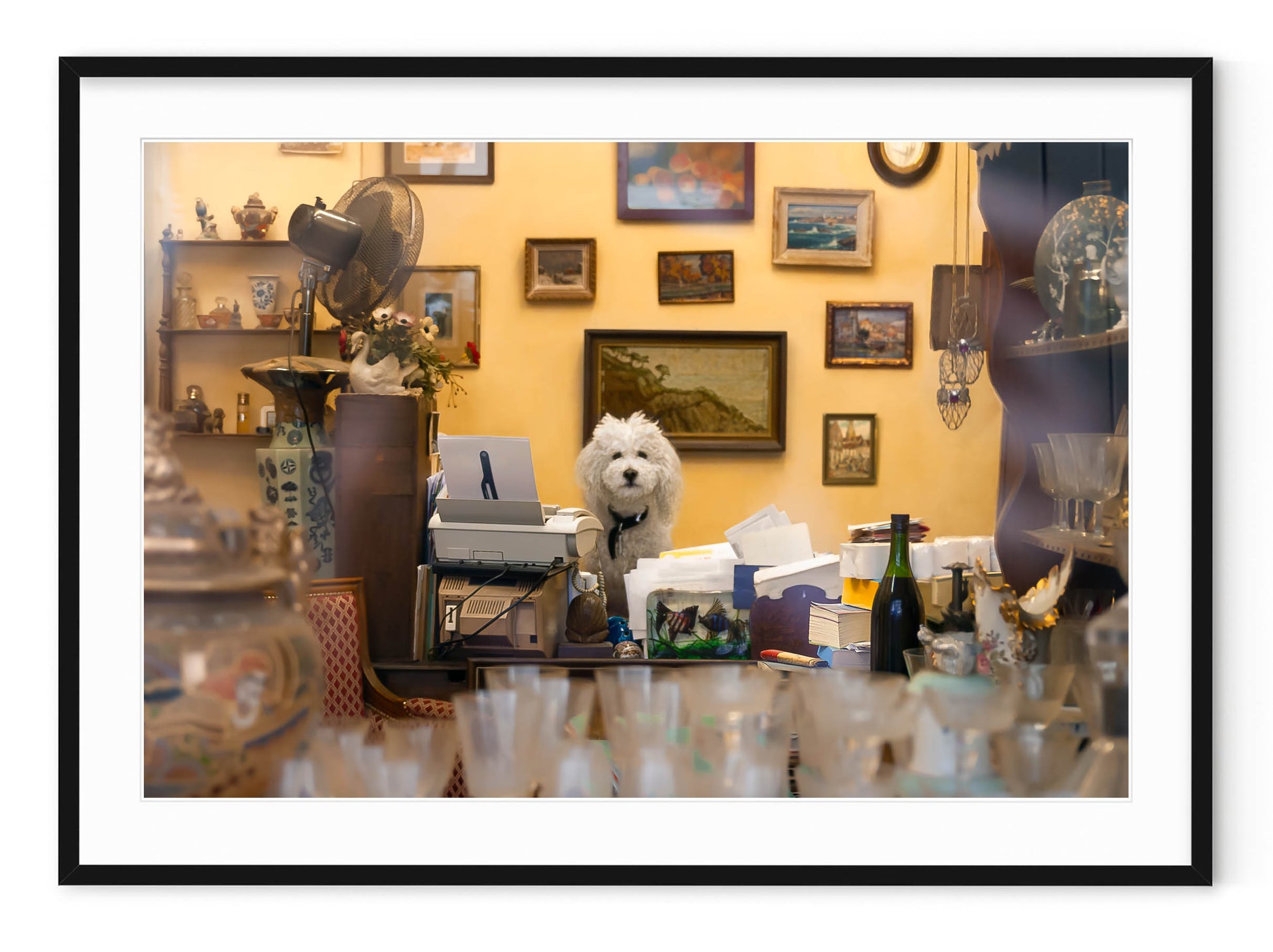 Description: Parisian vintage shop during off hours with guard dog at desk.