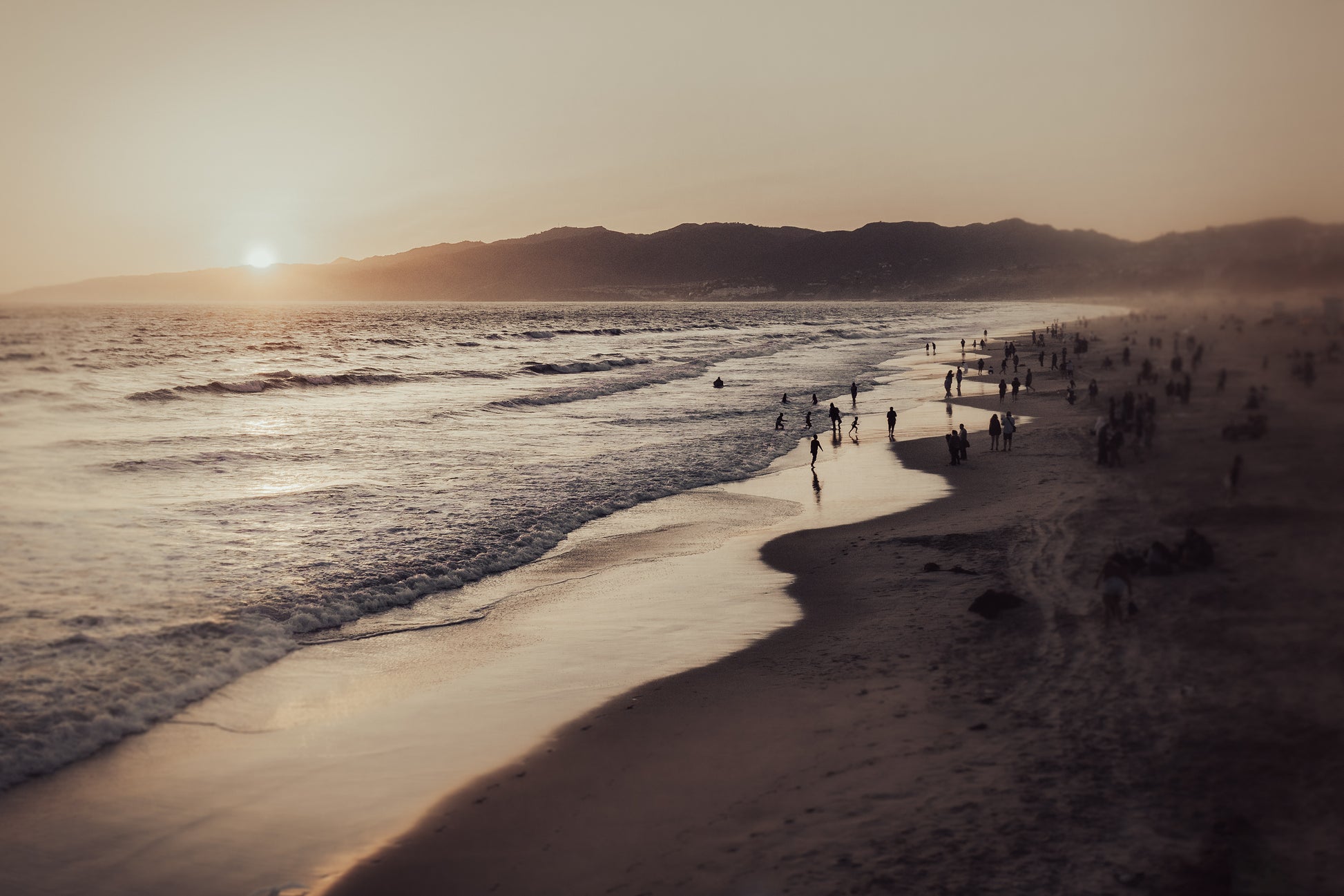 Description: Dramatic landscape of the beach at sunset in Santa Monica, California.