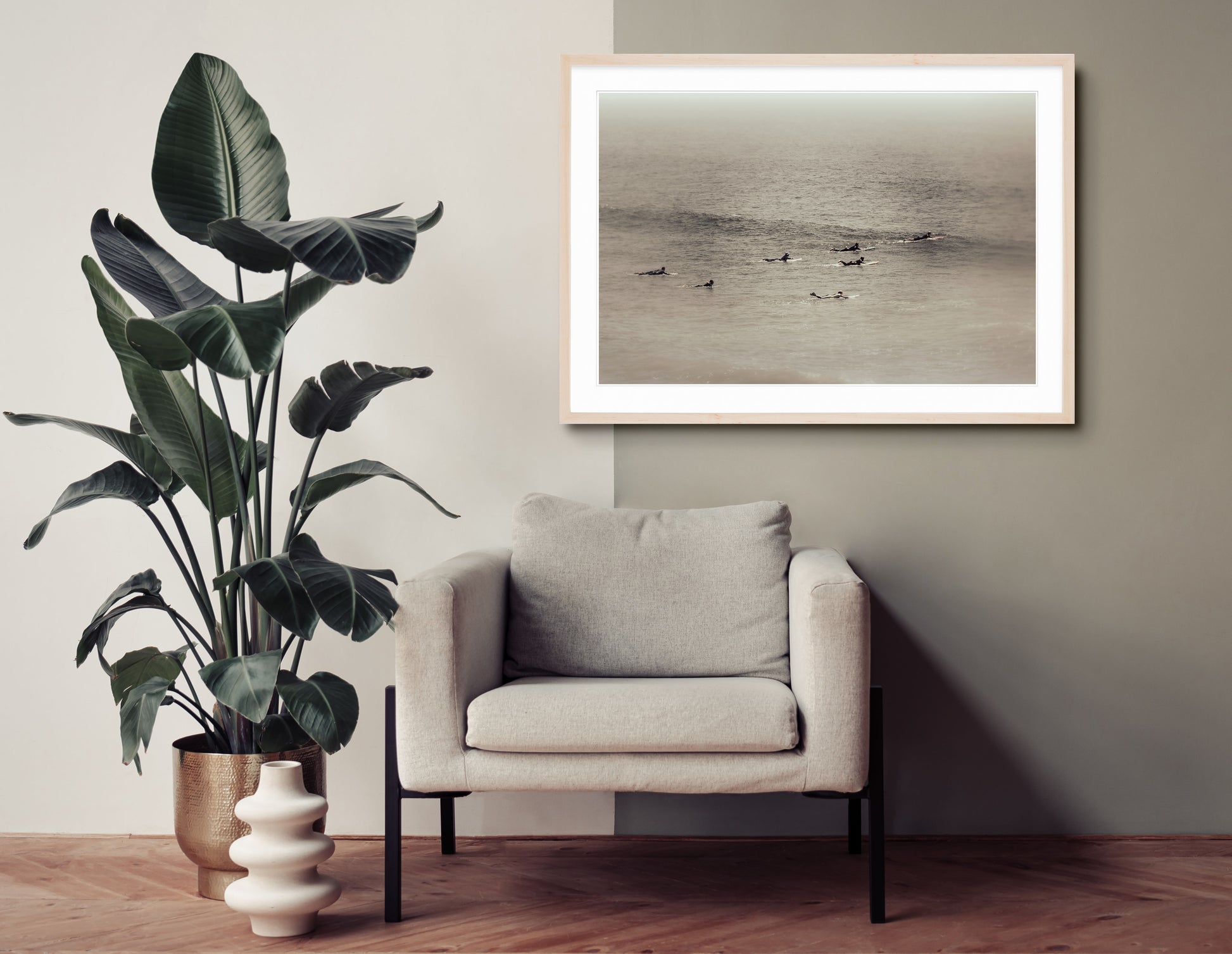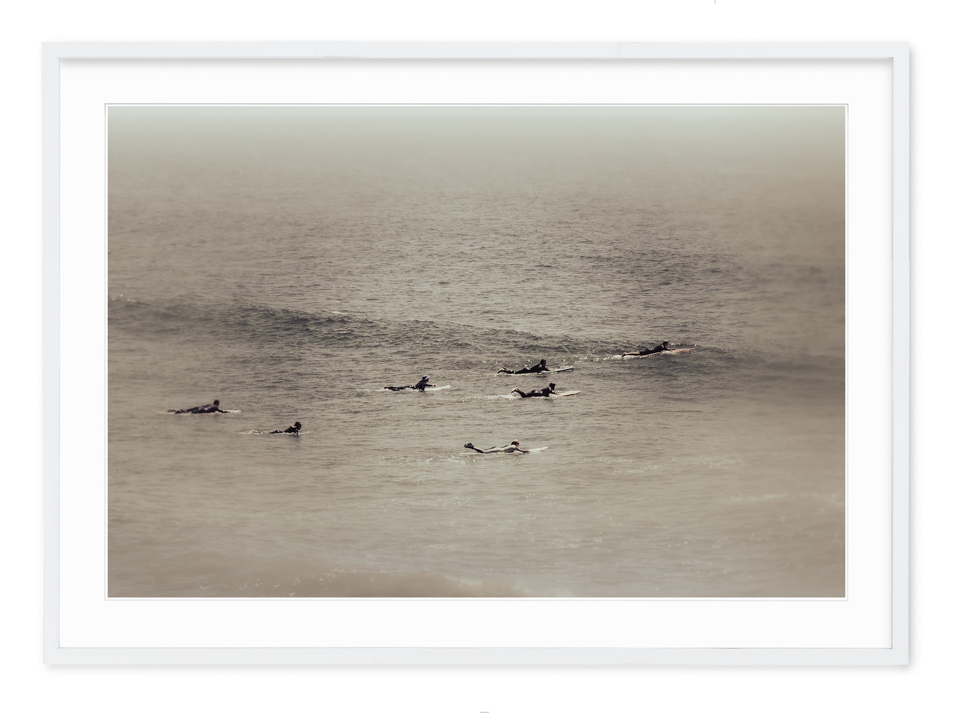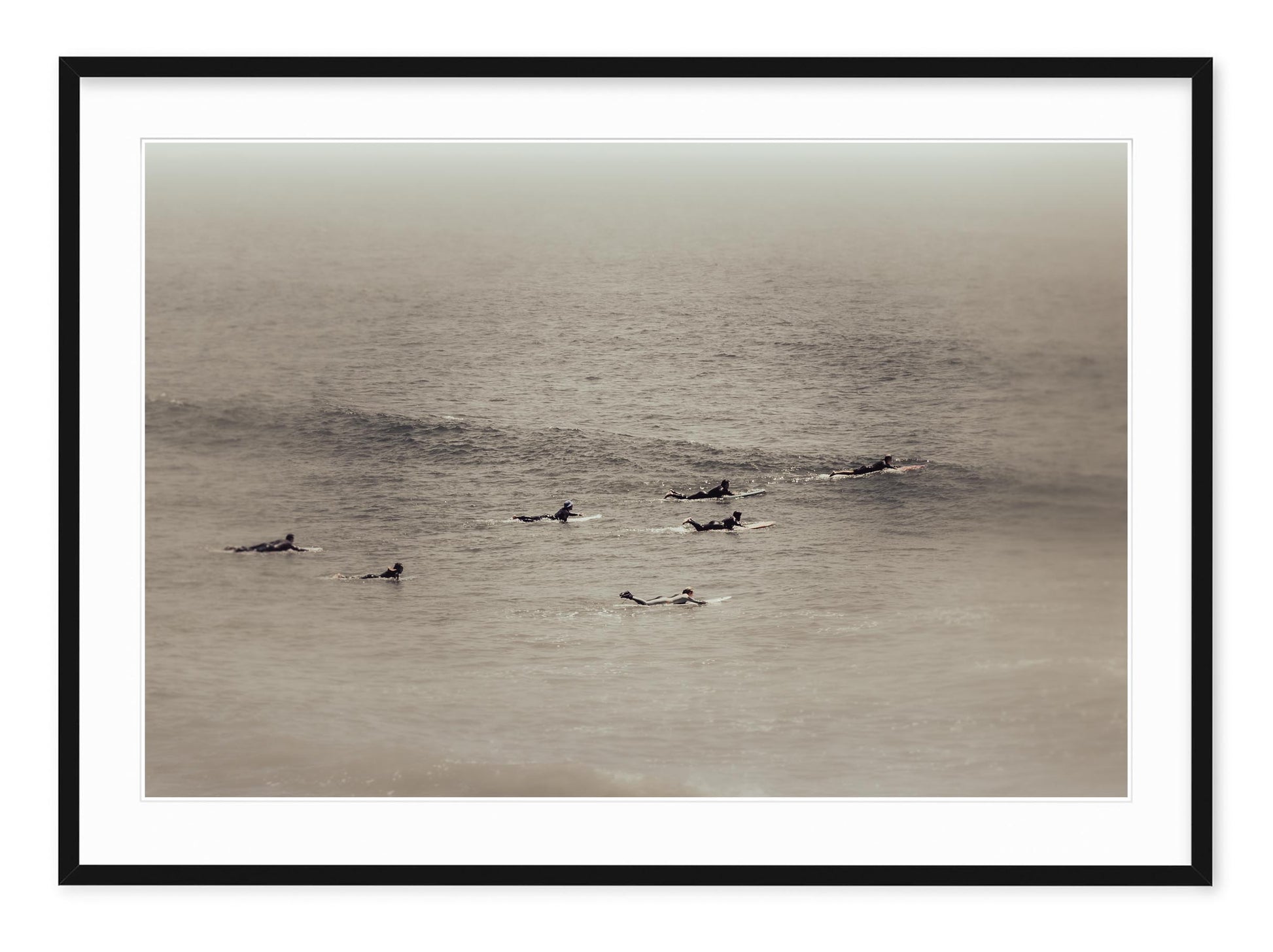 Description: Group of surfers paddling out in Santa Cruz, California.