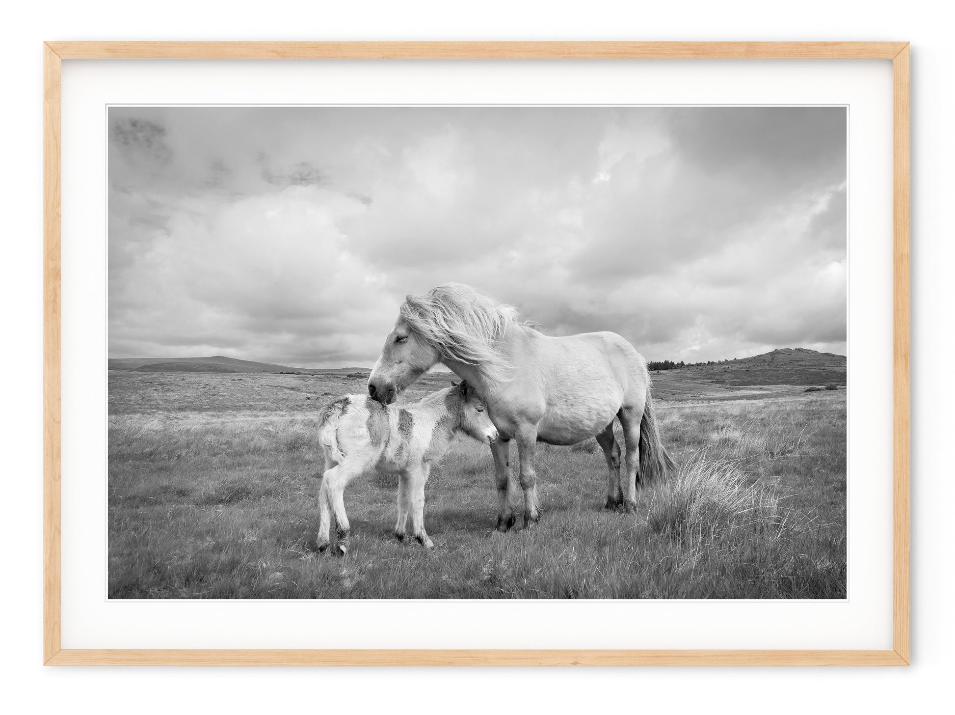 Description: English landscape of wild mare and her newborn foal in Dartmoor National Park.